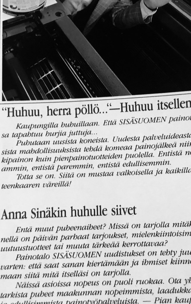Luin Pekka Himangan kirjan Hautomo. Kirja oli painettu paperille ihan oikeassa kirjapainossa ja Suomessa vuonna 1997 Sitran 30-vuotisjuhlaan.